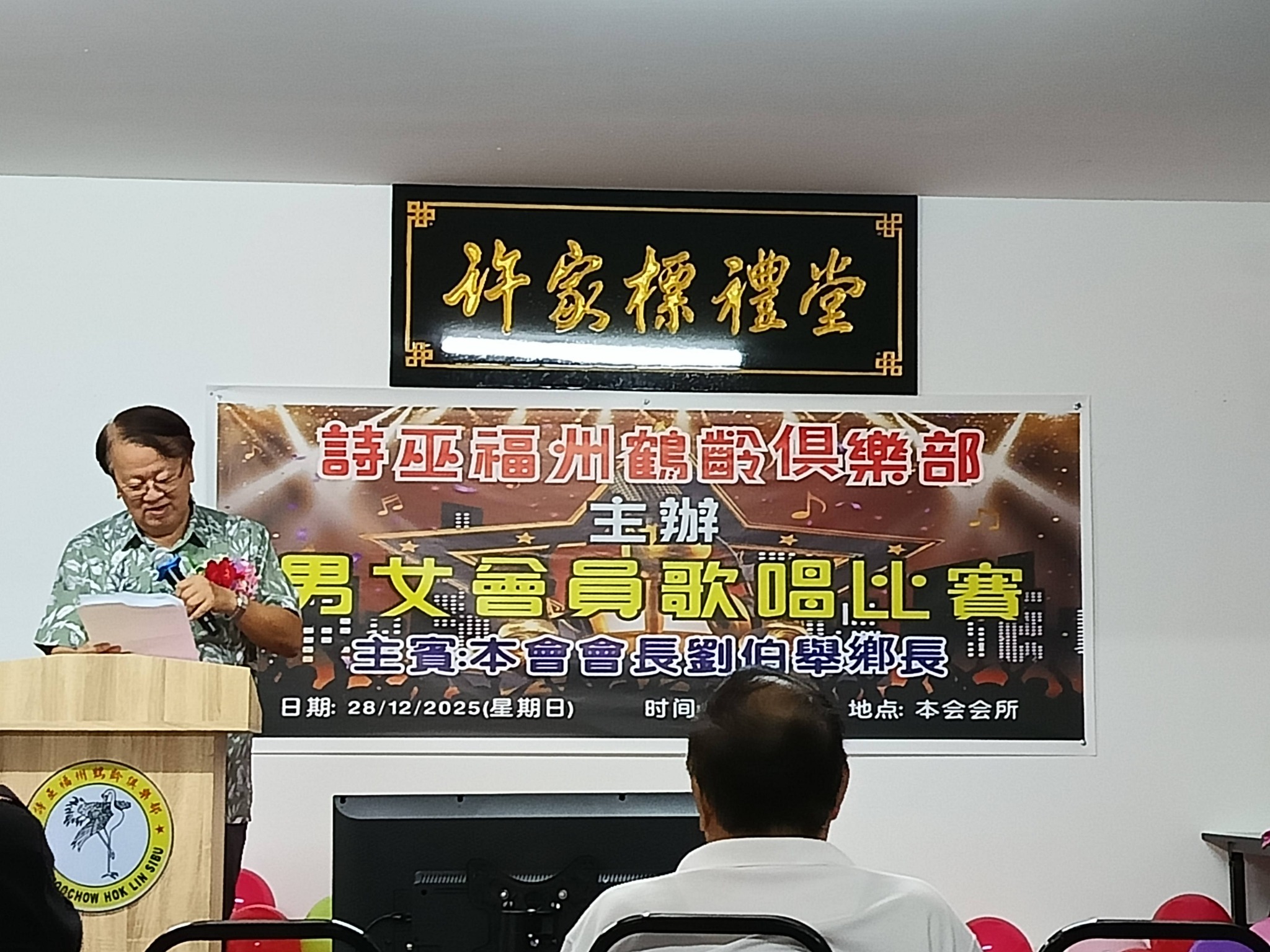 诗巫福州鹤龄俱乐部将于12月28日(星期日)早上9时30分,在该会第三楼许家栋礼堂举办2025年会员男女歌唱比赛。会长刘伯举致词时寄语会员:人生精彩在于心态,无关年龄,保持开朗便能健康快乐。