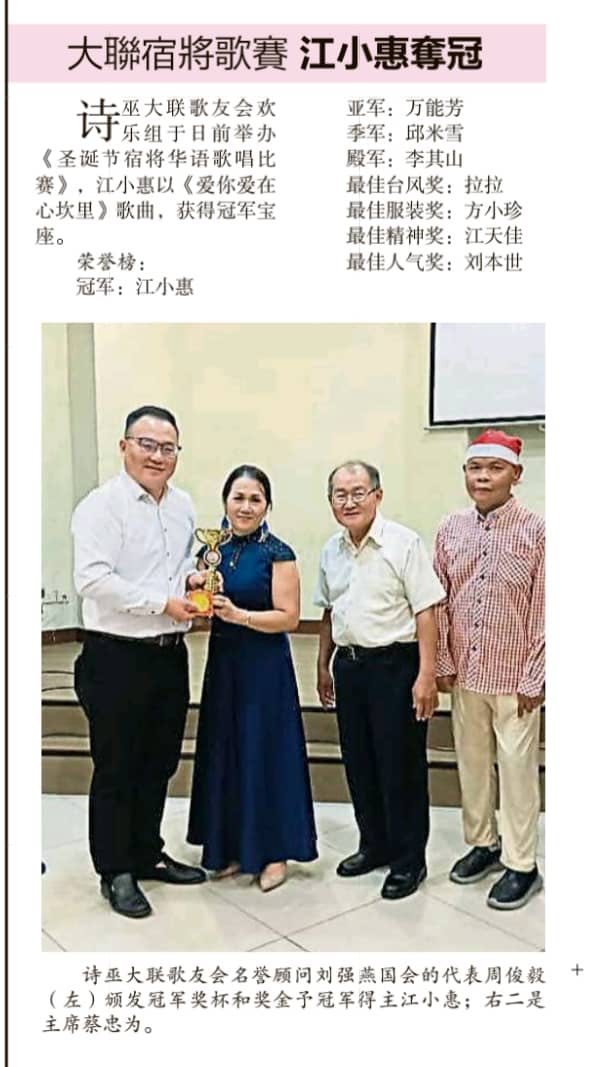诗巫大联歌友会文娱团于日前成功举办“模仿圣诞人物比赛”以及《圣诞节宿将华语歌唱比赛》。由刘千瑜获得“模仿圣诞人物比赛”冠军、江小惠以《爱你爱在心坎里》歌曲,获得《圣诞节宿将华语歌唱比赛》冠军宝座。