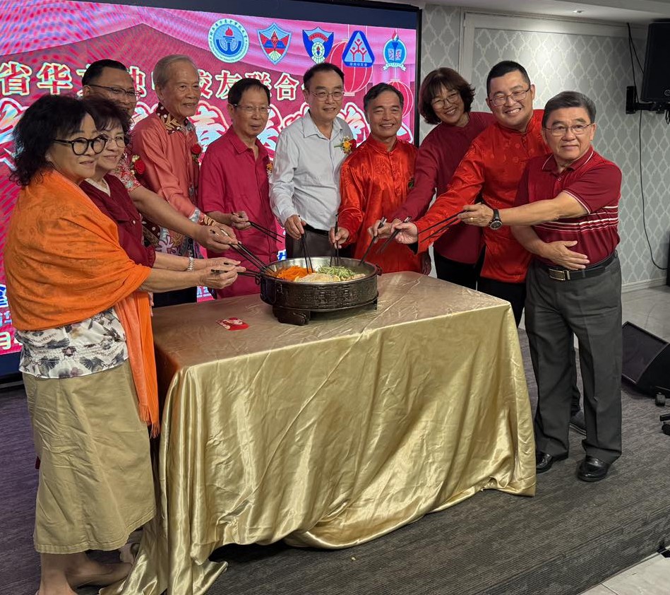 诗巫省华文独中校友联合会“2026丙午年新春联欢晚会”捞生仪式。左起为诗巫省华文独中校友联合会顾问甲必丹白燕丽、陈兰梅、筹委会主席兼署理会长尹士华、诗巫省华文独中董联会主席张泰卿、砂拉越华文独立中学董事会联合总会主席刘利民、诗巫乡村议会署理主席黄振渊、诗巫省华文独中校友联合会会长苏启友、公教中学校友会代主席林红萦、公民中学校友会主席江永建的代表谢其楠、光民中学校友会候任主席林兴旺。