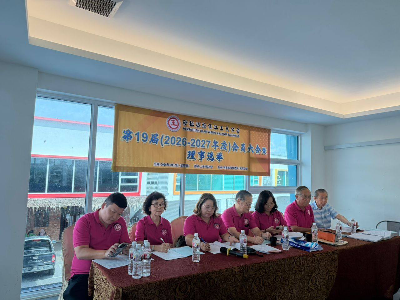 砂拉越拉让江王氏公参召开第十九届(2026-2027年度)第一次会员大会暨理事选举。右起分别为署理主席王勤成、会务顾问暨名誉主席王义生、秘书王晶晶、主席王启勃、财政王春颖、副主席王金茱及青年团团长王是励。