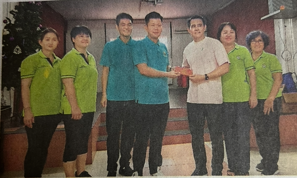 砂拉越徐氏公会青年团团长徐传信(左4)捐赠红包给卫理福儿院,由院长刘士通(右3)接收。