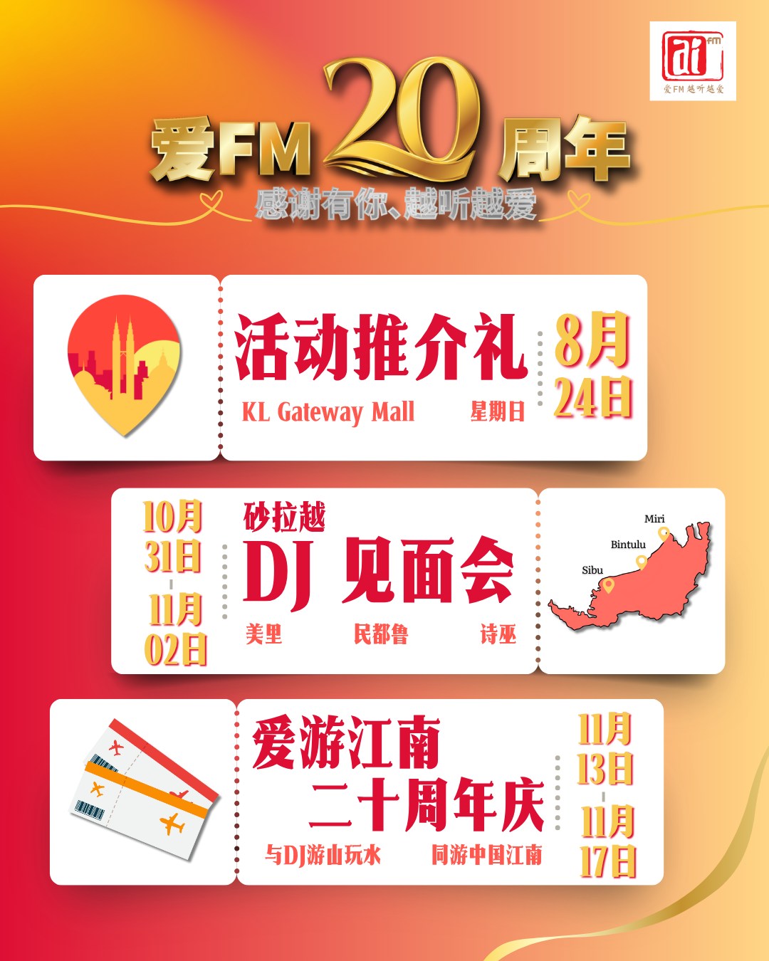 诗巫潮州公会与砂第三六七省嘉应同乡会将于11月2日(星期日)晚上7时30分,在诗巫省华团三楼会干淑贞堂联办“爱FM电台主播DJ歌手邓佩银粉丝见面会”及“爱FM20周年庆见面会”。