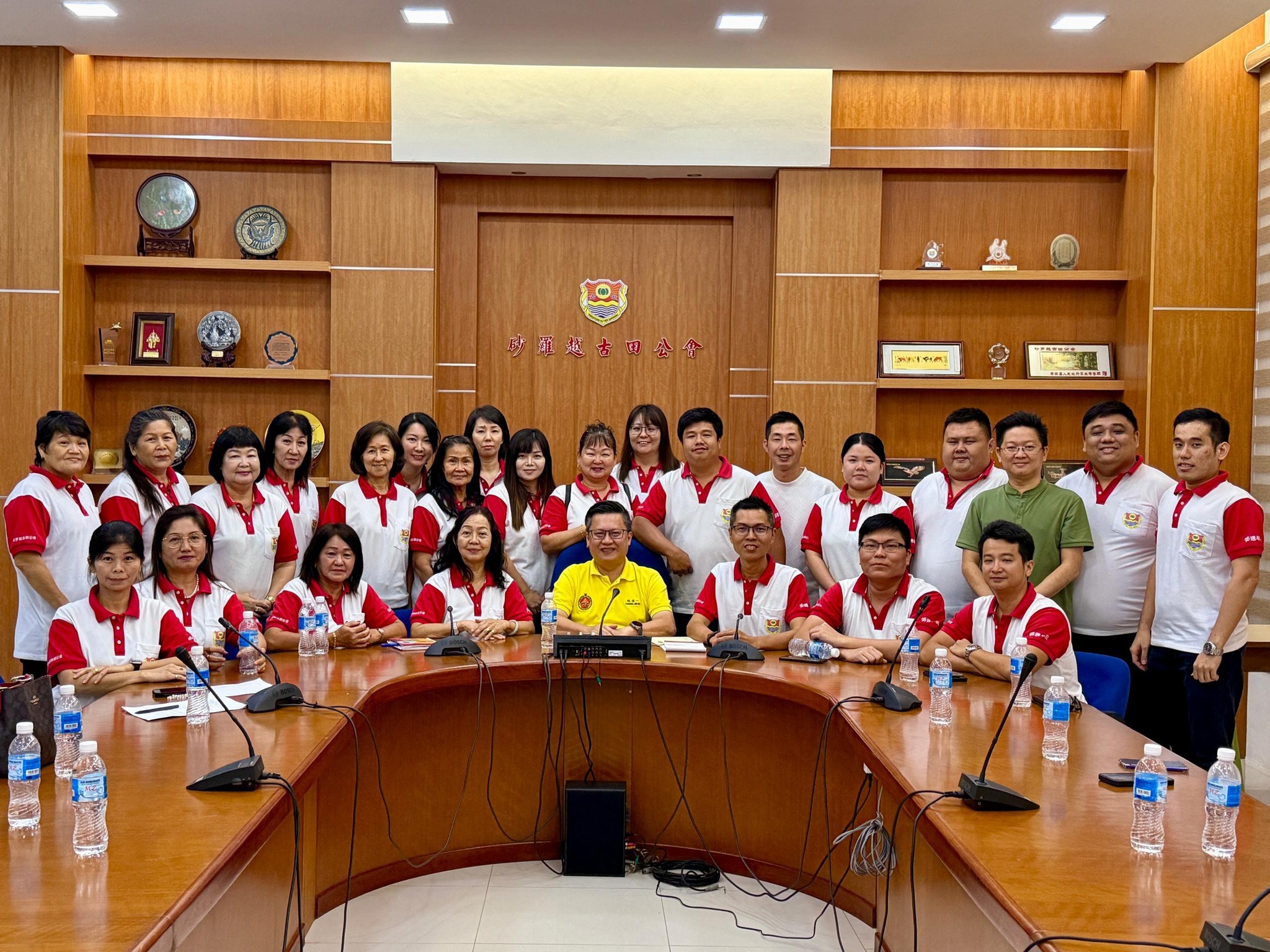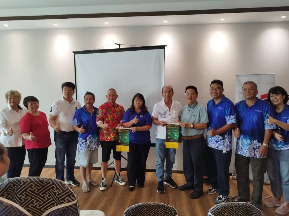诗巫大联歌友会名誉顾问拿督钱本统(前排右4)授旗予该诗巫队伍。前排左3为主席蔡忠为