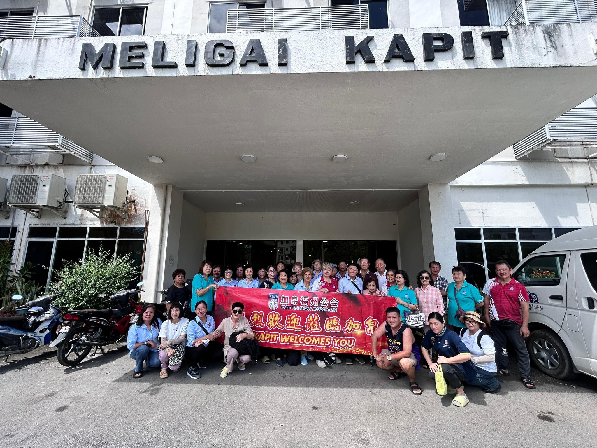 加帛福州公会代表迎接砂拉越屏南公会松龄组访问团员时合影。次排左5起为加帛福州公会妇女组主任张顺仙、乐龄组主任本固鲁前思好及主席谢荔清(左8)。