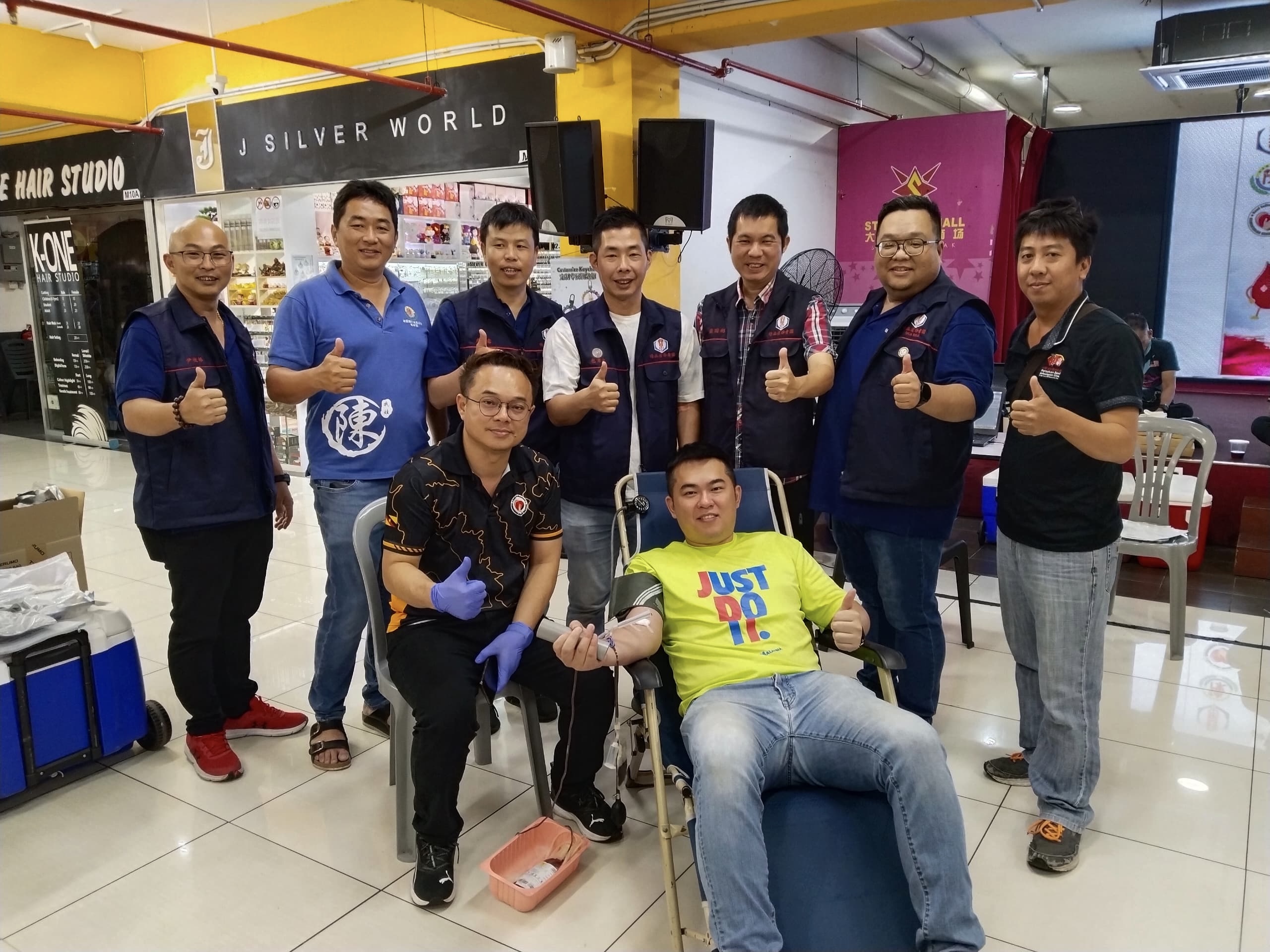 团委与咨询长许为建(捐血者)合影。后排站者左起为副资讯尹俊银,副财政陈丁辉,副组织 县议员詹绍意,体育包章史,秘书萧国彬,副福利张四维,卢武昌