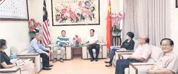 诗巫闽清同乡会主席刘恭福县议员(左3)率领一行人礼貌拜会中国驻古晋总领事邢伟平阁下(右4)。左2为马福秘书长刘锦虎,右1及2是诗巫闽清同乡会秘书刘宜福及署理主席兼孝亲敬老会筹备会主席许道平。