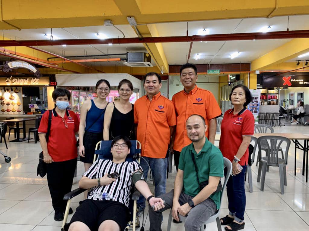 砂拉越会宁同乡会青年团副团长江先土(站者右三)陪同儿子捐血时合影。