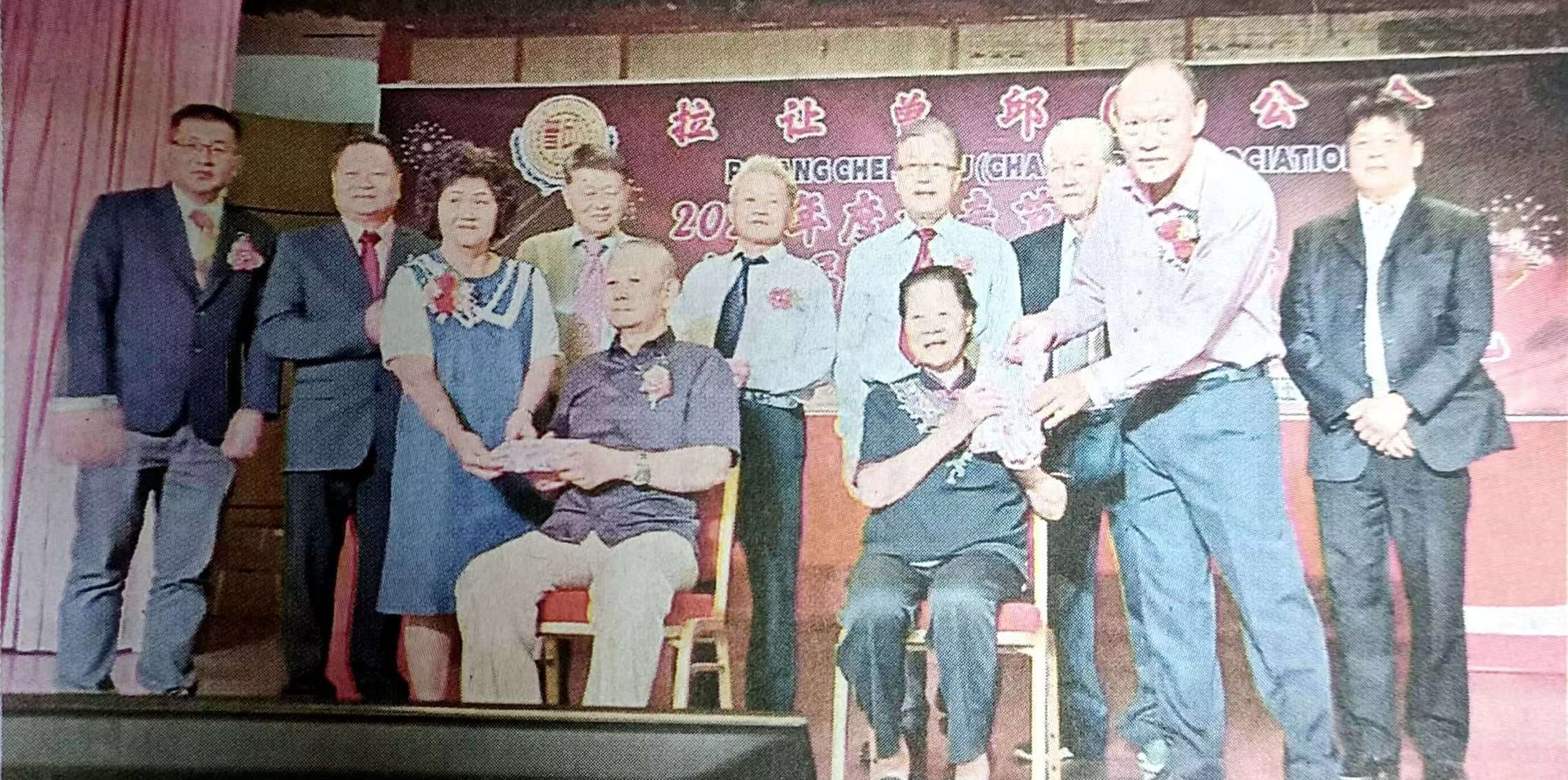 顾问邱昌忠伉俪赠送孝亲礼物予现场最年长的长者,即83岁的曾春水(坐者左)及89岁的朱秀英(坐者右)。