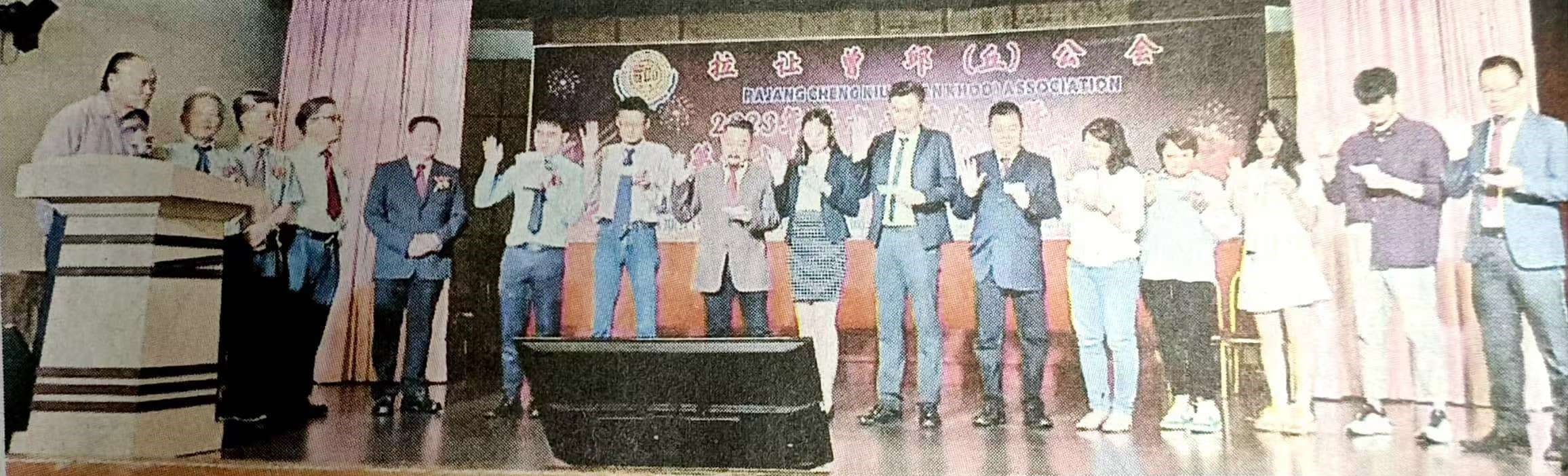 新届理事会主席(左四)带领理事们在名誉主席们面前宣誓就职。左起为监誓人邱维宋、邱维国、顾问邱昌忠及曾同美。