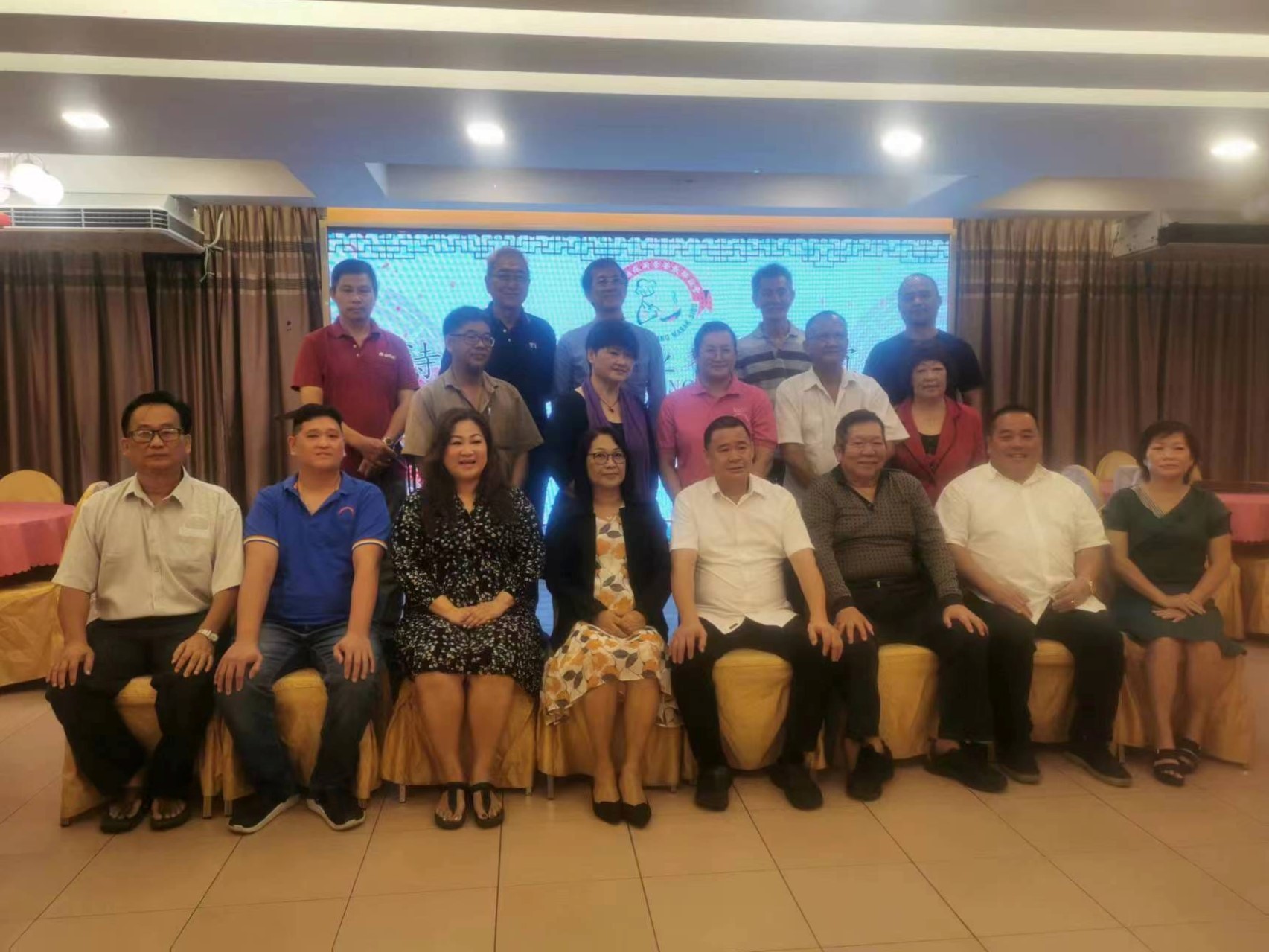 诗巫姑苏餐饮联谊会新届理事合影。坐者左起为副财政林涡凉、财政谢化开、秘书吴玟葶、主席夫人罗丽美、黄世渊、会务顾问黄贤钻、理事黃仲健和妇女组主任林能毅。