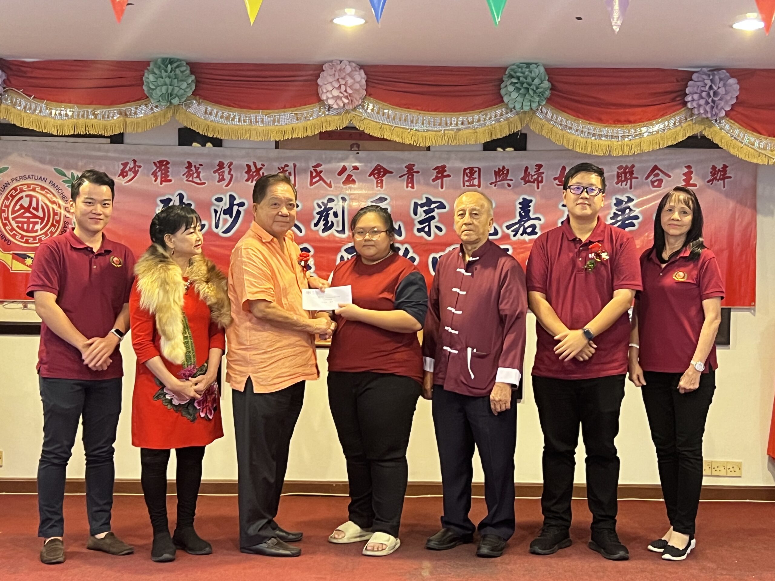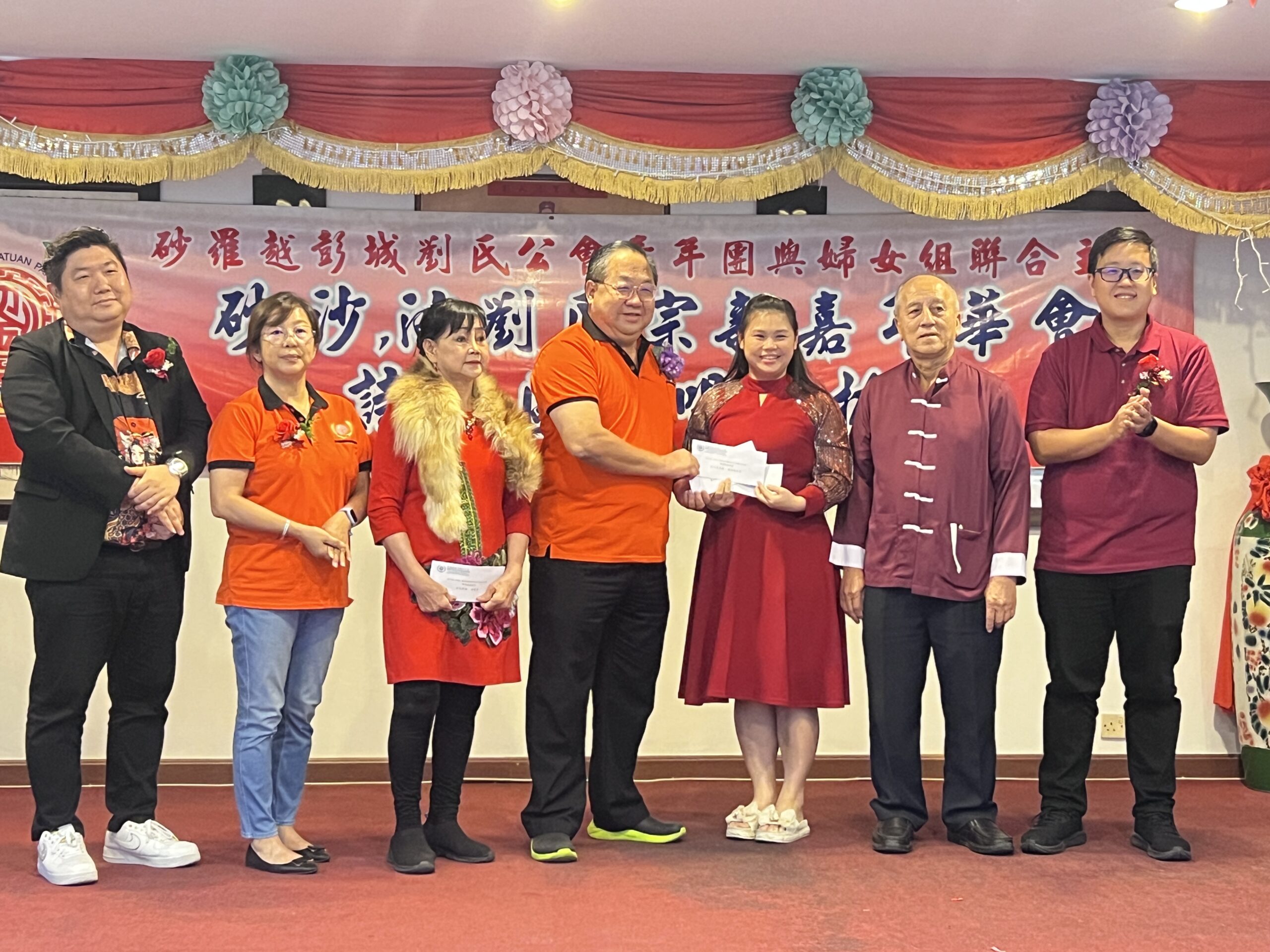砂拉越彭城刘氏公会主席本固鲁刘贤远(左四)颁发歌唱组选拔赛刘氏太太组冠军奖、最佳服装奖及最佳台风奖给林欣爱。右为青年团团长刘可杰。