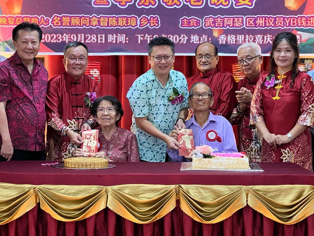 砂宁德公会主席许忠全(左二)和武吉阿瑟区州议员钱进一(左四)分别颁发敬老红包给黄贵桃(89岁)和江克祥(88岁)。左为砂宁德公会创会长拿督钱本统,右是晚宴筹委会主席黄小萍。