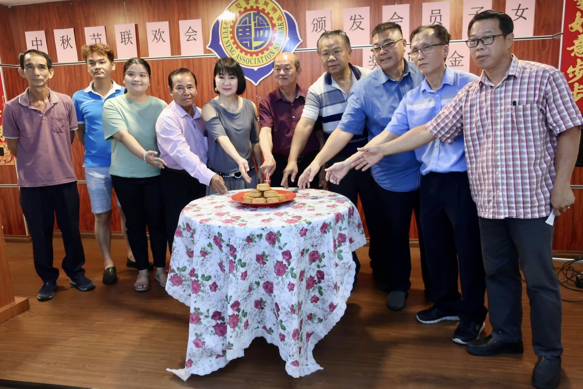 众人联合切月饼。左四起为砂拉越会宁同乡会乐龄组主任胡伍华、妇女组顾问江萱爱、会长江先明、名誉会长江贤钦、署理会长甲必丹江先平、副会长甲必丹冯大盛、秘书江泽经。
