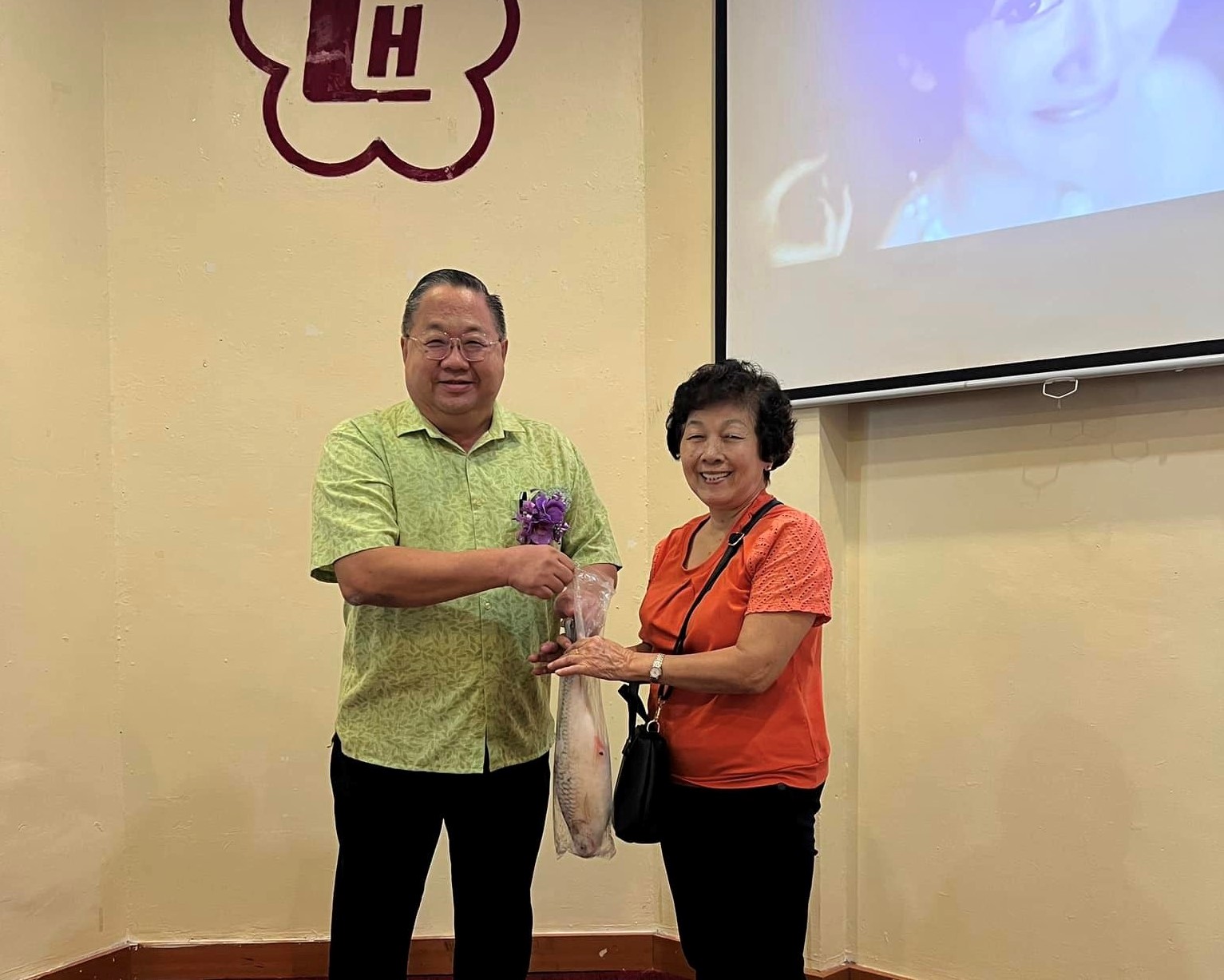 砂拉越彭城刘氏公会主席兼乐龄组顾问刘贤远(左)移交“鲜鱼”给幸运儿。