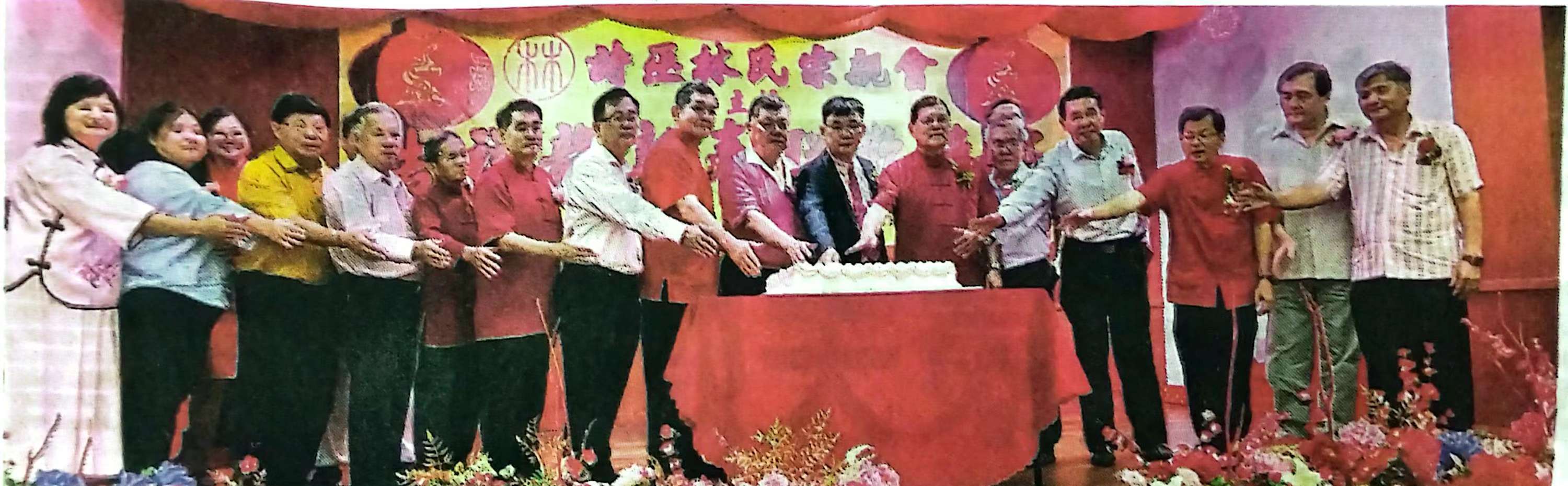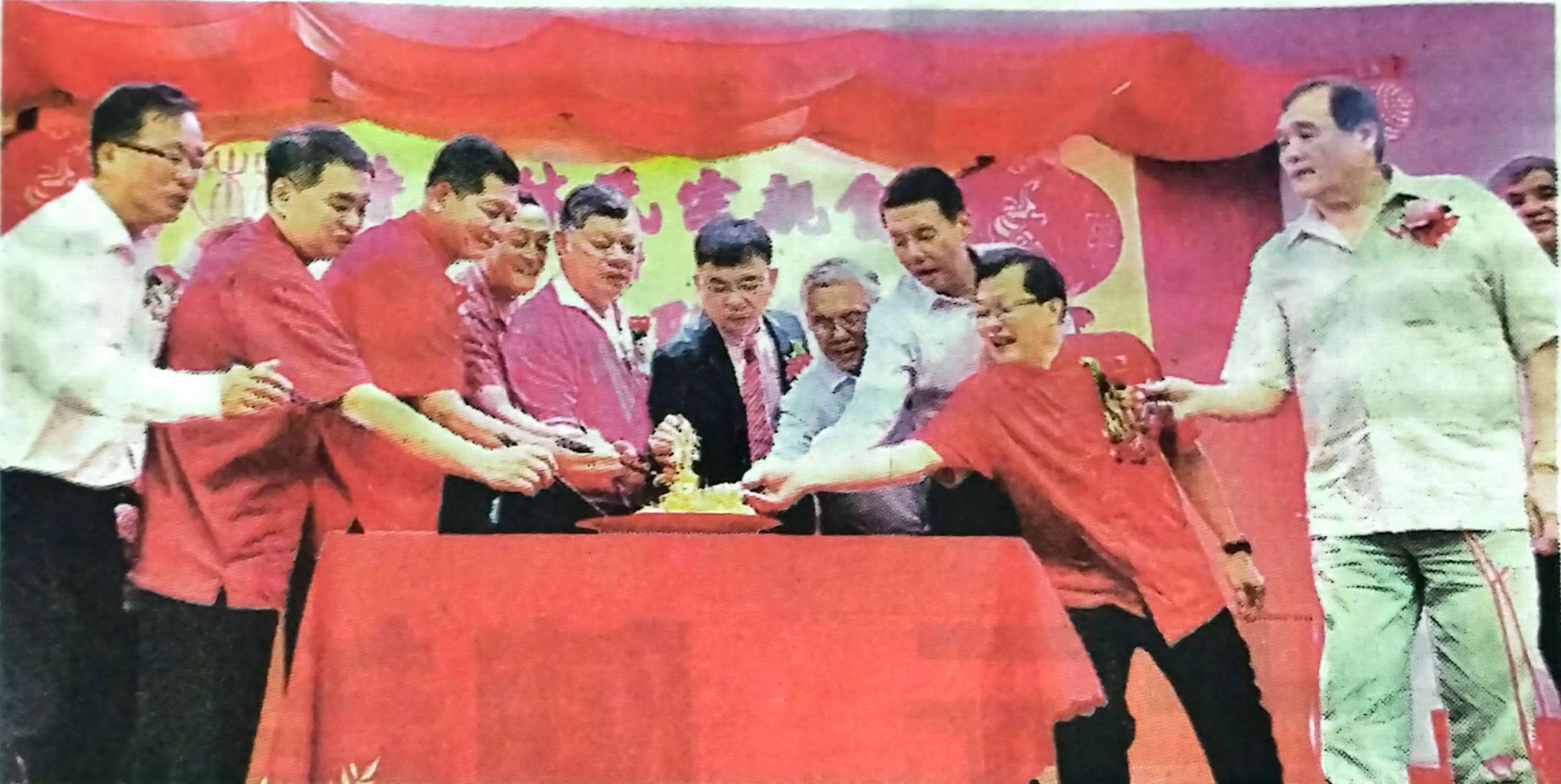 众嘉宾联合切新春蛋糕。前排右六起为诗巫林氏宗亲会署理主席林仁民、主席林国栋、会务顾问林恒实及筹委会主席林以善。
