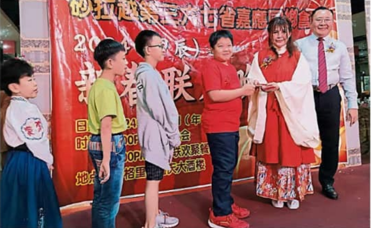 砂第三六七省嘉应同乡会理事兼新春红包赞助人郑莉莉派发红包予孩童。