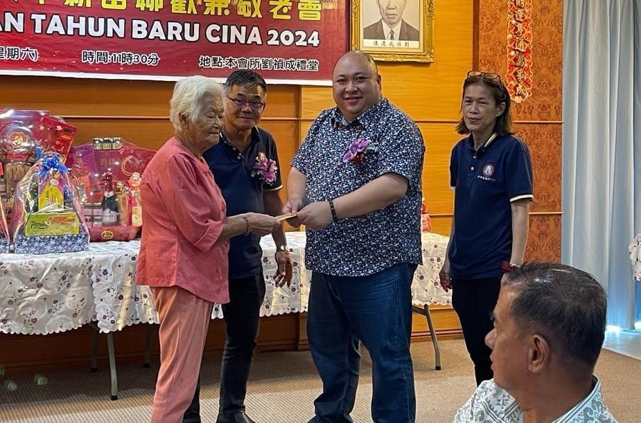 阿伦州议员颁发最年长寿星婆红包于周爱全,左二为财政严品禄,右为妇女组长林格凤。