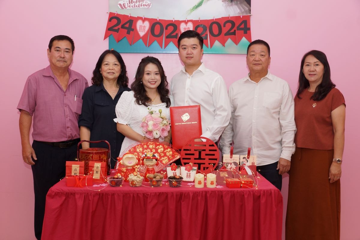 2月24日早的注册仪式由诗巫省华人社区最高领袖天猛公拿督刘利民担任证婚人。出席观礼的有双方家人和亲戚朋友。