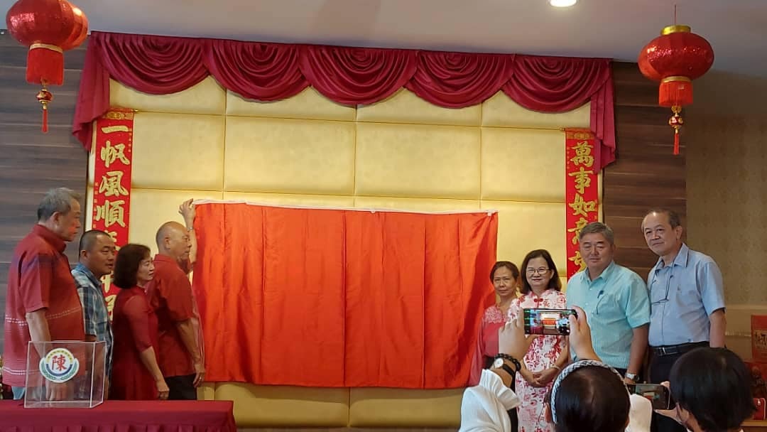 诗巫颍川陈氏公会主席陈则旅(左四)为“母女之爱” 比赛主持揭幕仪式。左起为署理主席陈兆隆、财政陈小龙、妇女组主任兼筹备会主席陈俏颖,右起为永久名誉 主席陈立永及本固鲁陈则生;秘书陈秀凤、公会婚姻助理注册官拿汀陈黄晓红。