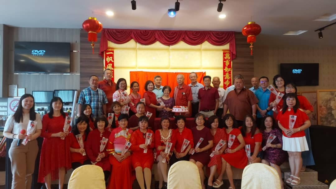切过三八妇女节庆祝蛋糕后,活动赞助人暨诗巫颍川陈氏公会主席陈则旅陪同夫人夏爱芳献花予妇女组组长陈俏颖及女性与会者。
