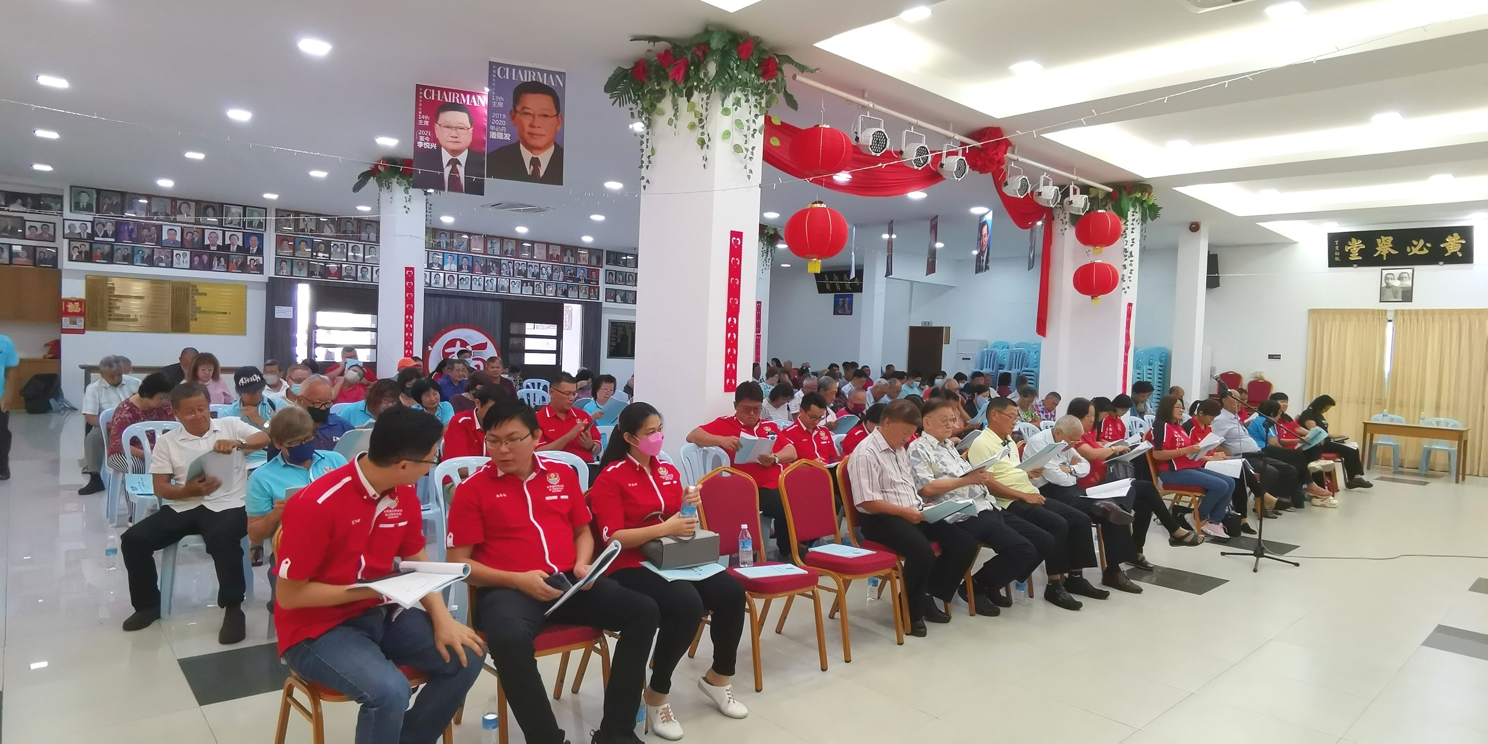 砂拉越古田公会召开第60届第1次会员大会。前排右五起为署理主席甲必丹吴仁煌、财政钱本富、主席李悦兴、副秘书陈香仙。