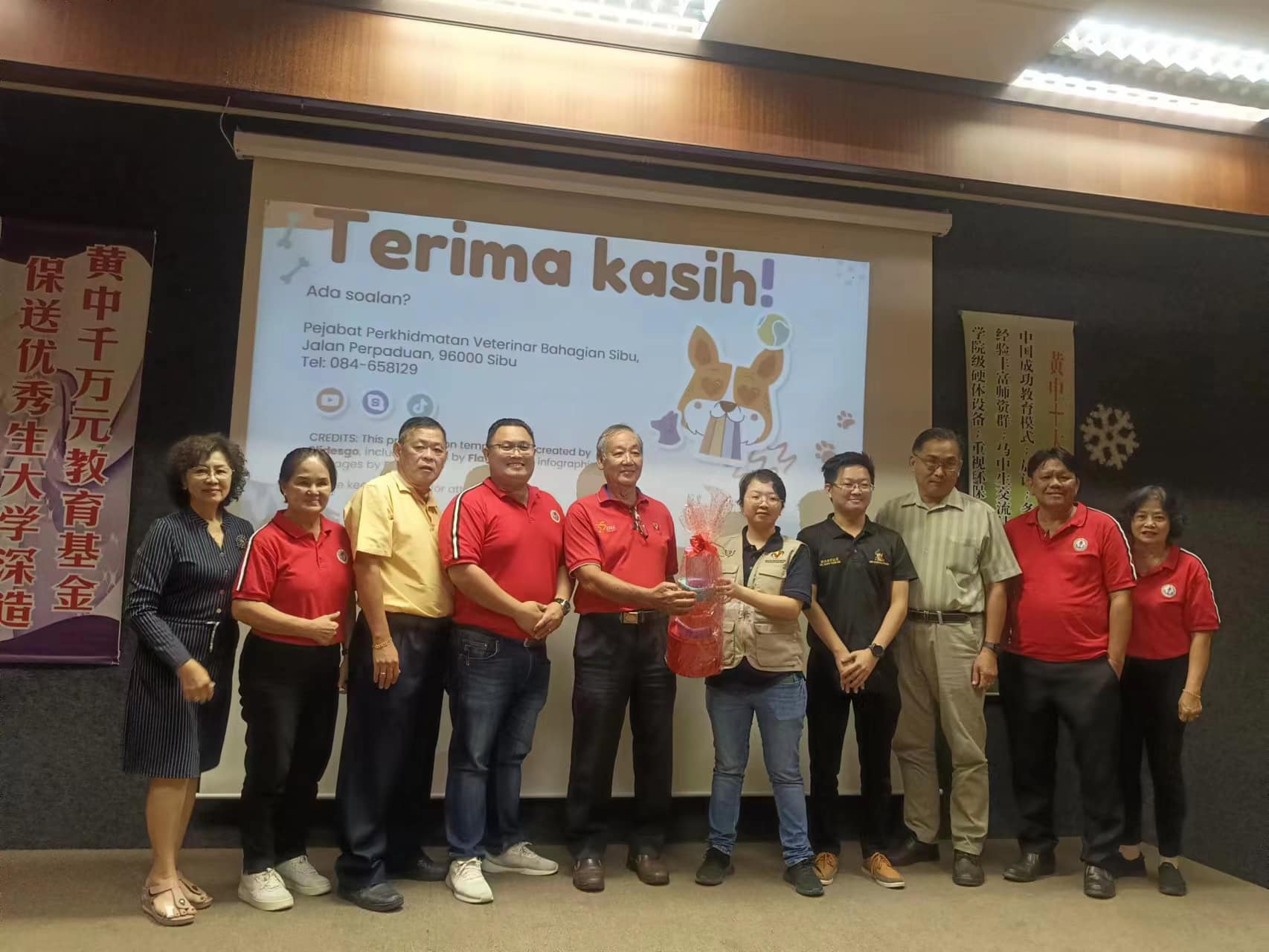 黄乃裳中学校友会创会45周年之环保回收及预防狂犬病讲座筹委会主席刘增振(左五)赠送纪念品给诗巫省兽医服务局局长常晶晶(右五)。右三起为黄乃裳中学校长卢友雄及诗巫市议会反狂犬病宣传运动负责人龚德濠;左四为校友会主席尹士华。