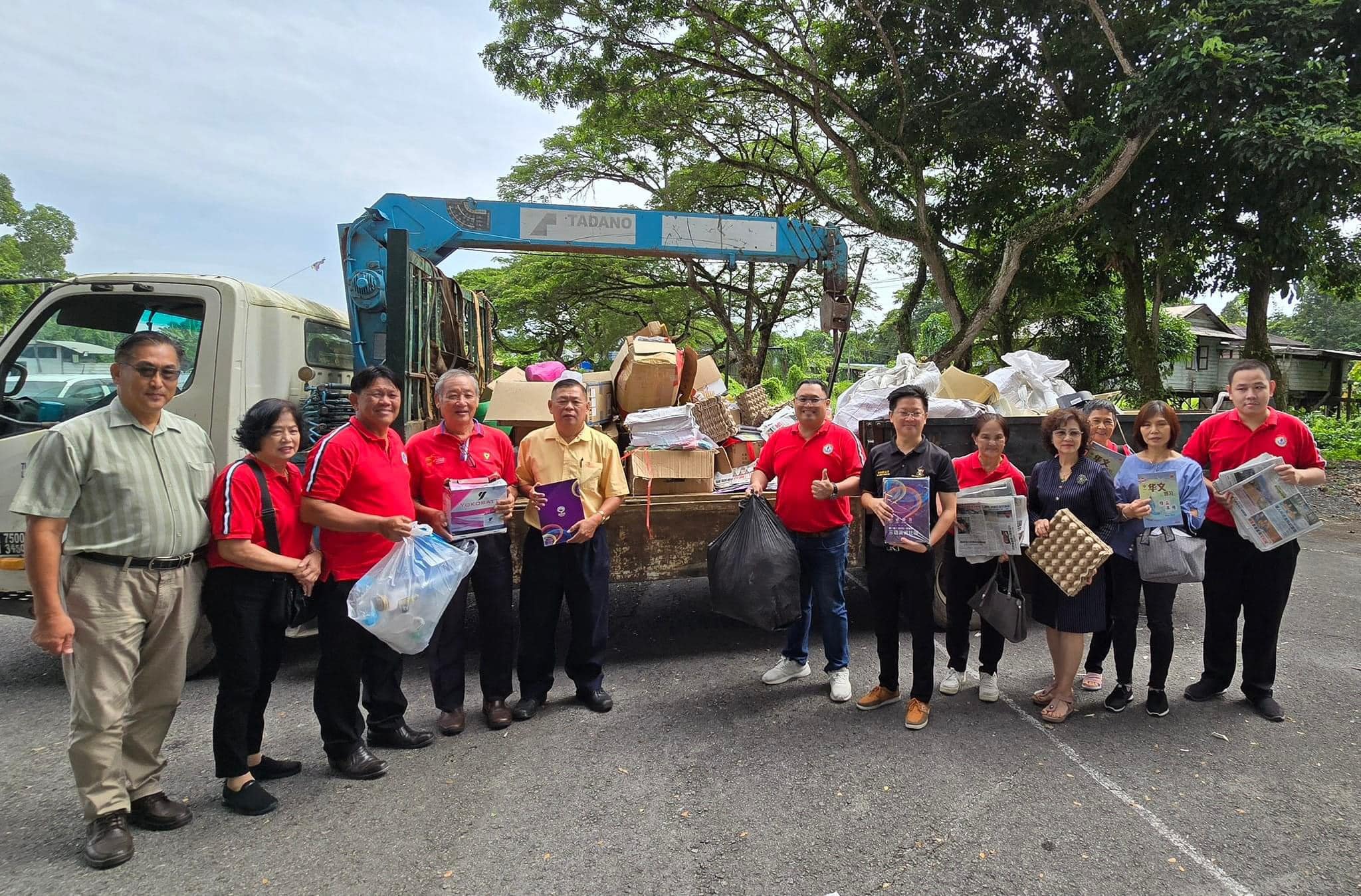 黄乃裳中学校友会创会45周年之环保回收活动获得民众踊跃响应,把家中可回收资源送往回收。图为黄万裳中学校友会、诗巫市议会及学校的代表在环保回收活动上合影。