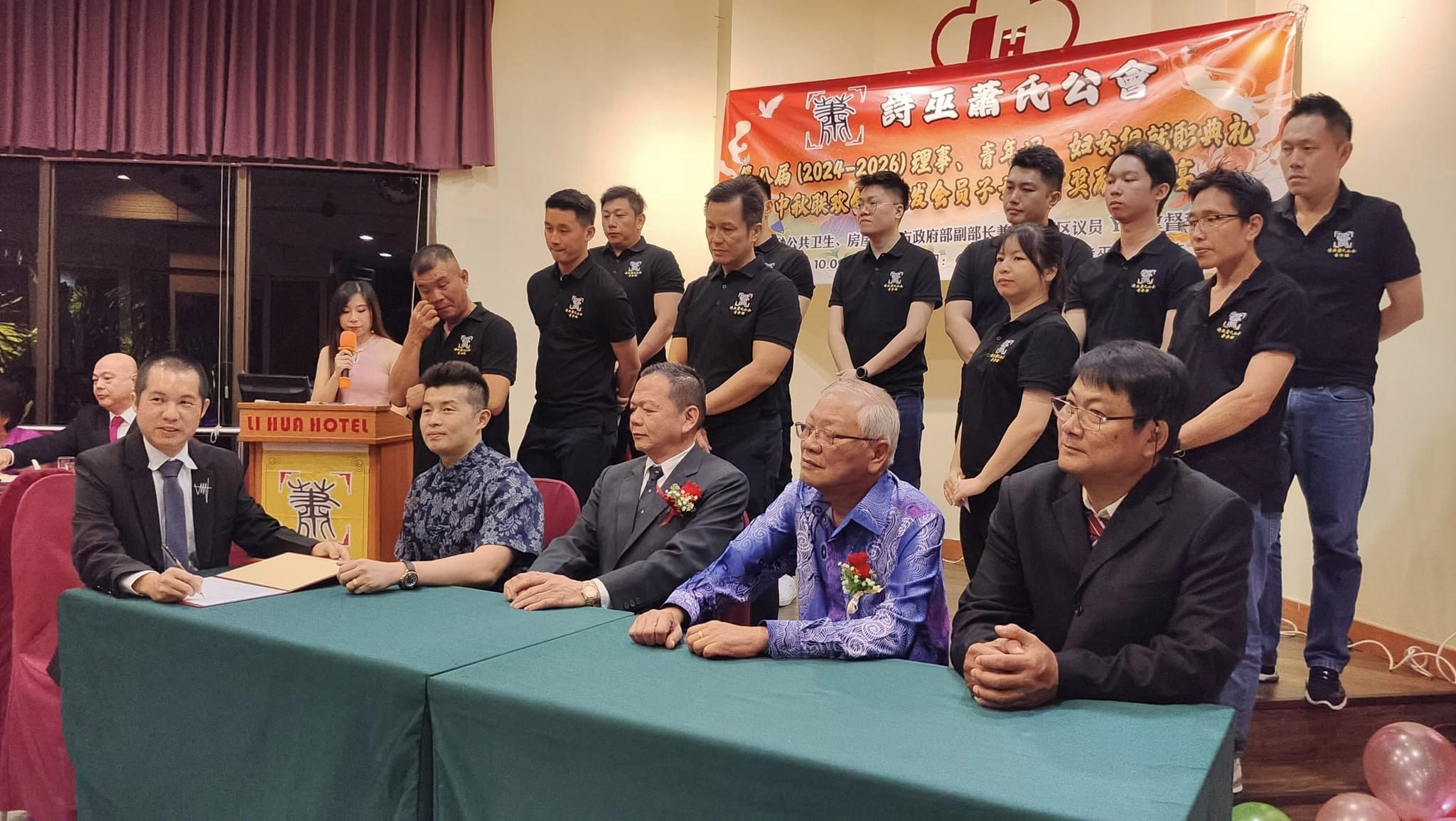 诗巫萧氏公会第八届青年团团长萧国彬签署宣誓书。前排右起分别为监誓人萧氏公会青年团创团长暨团督萧梧顺、诗巫省华团秘书长刘锦虎、会长萧梧胜及青年团团督萧行善。