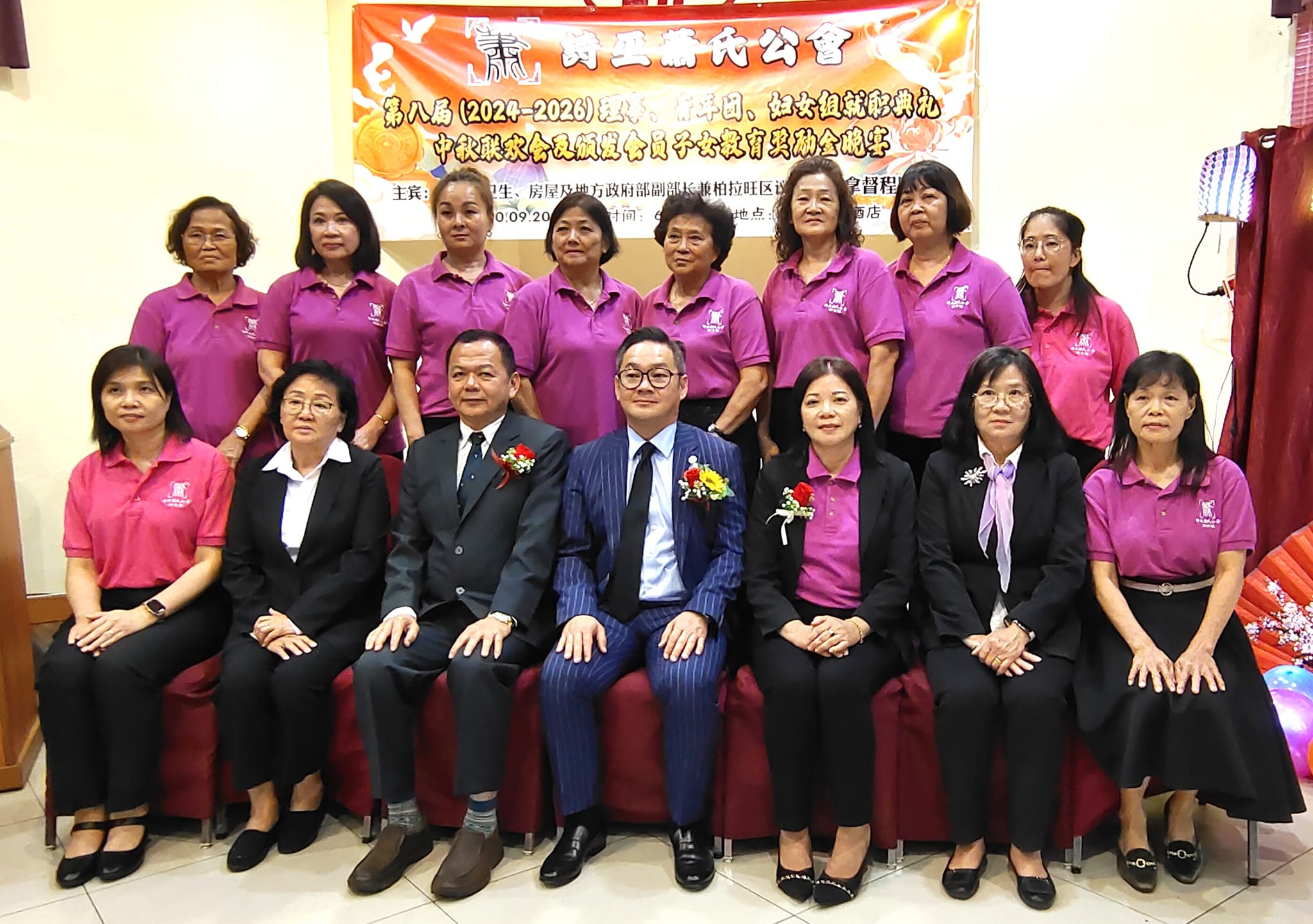 诗巫萧氏公会第八届妇女组宣誓礼后,全体妇女组组委在主任萧忆惠(前排右3)带领下与监誓人合影。前排右4起分别为活动主宾砂公共卫生、房屋及地方政府部副部长拿督程明智;会长萧样胜及妇女组名誉主任萧毓兰。前排右2为妇女组创主任暨名誉主任萧香兰。