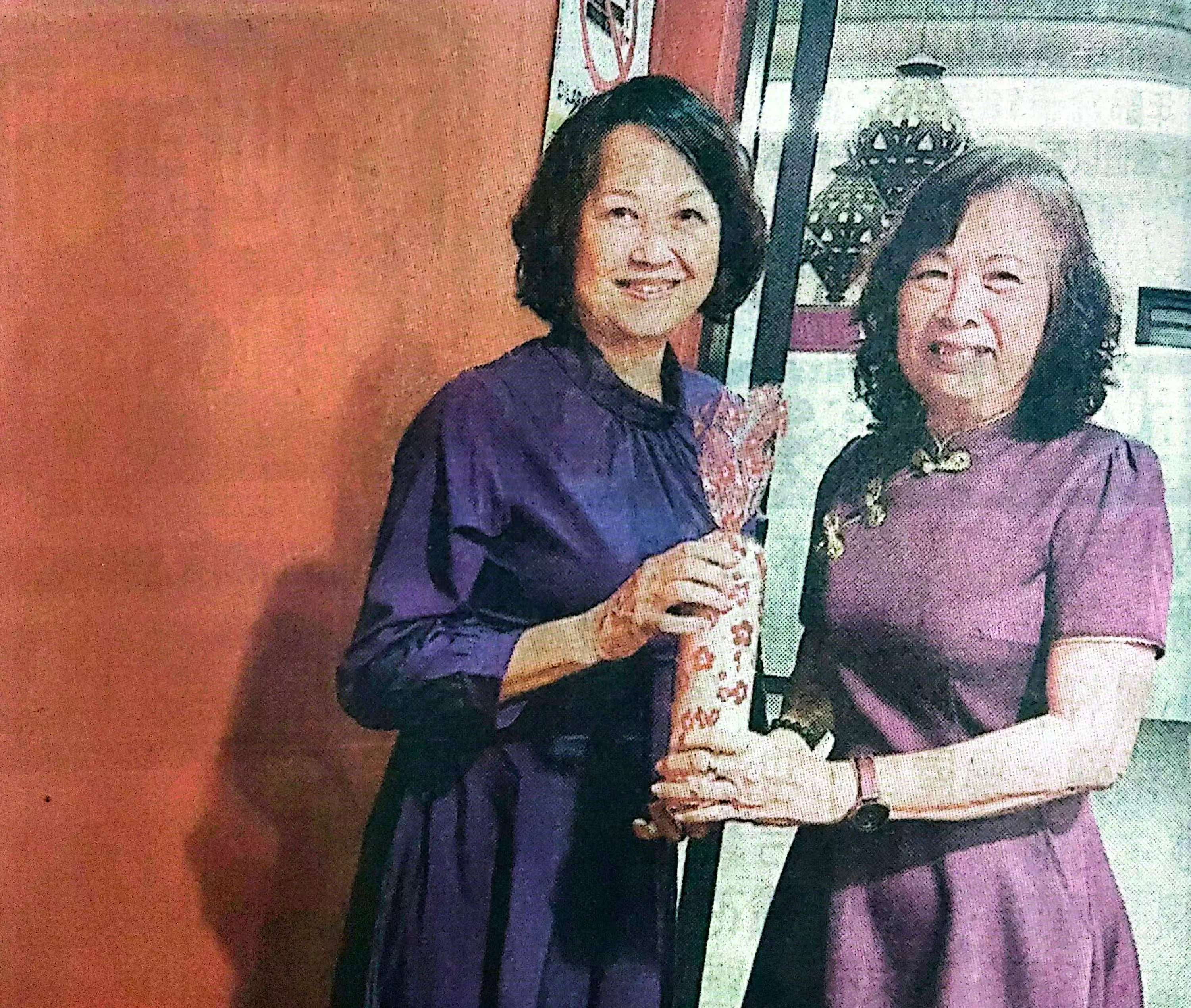 筹委会主席许赛仙(右)赠送三八妇女节礼物给诗巫高阳许氏公会秘书许碧芳。