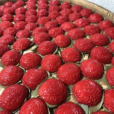 “红团圆润的造型、鲜艳的红色,象征团圆圆满、红火兴旺;馅料多为甜糯米馅,寓意生活甜蜜,或绿豆馅,象征发芽、生长,寓意家族开枝散叶、兴旺发达。制作时常以木模压出‘福寿’字样,或龟、桃等纹样。